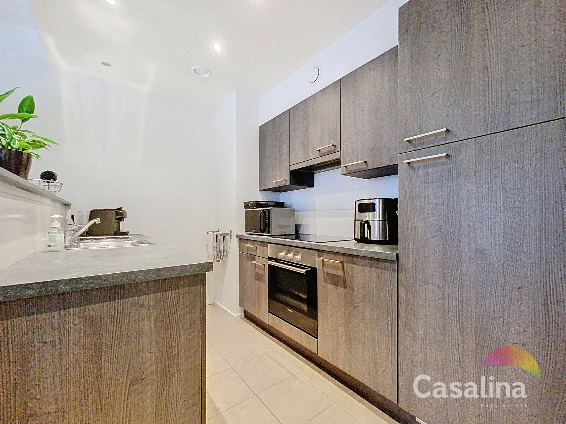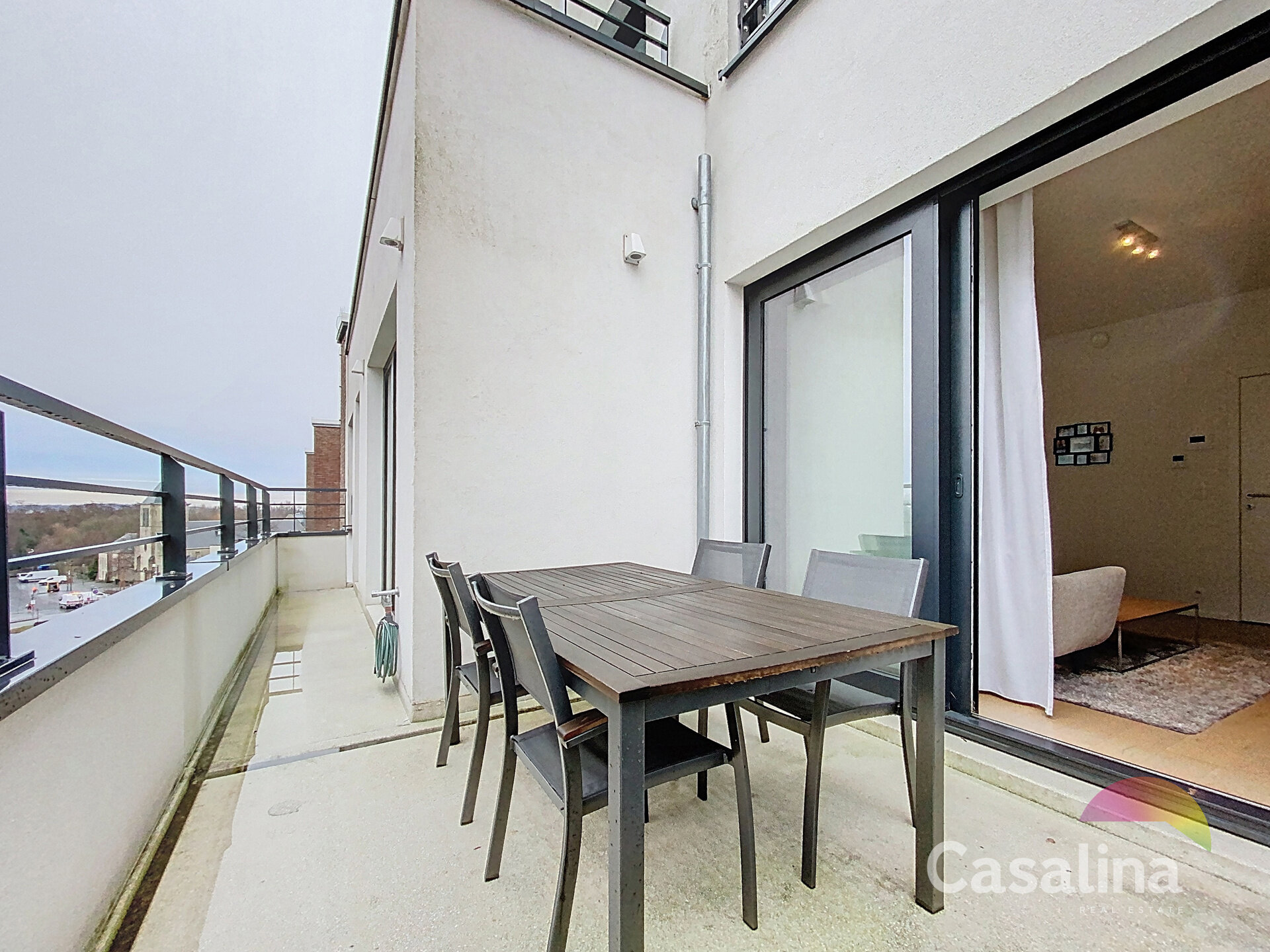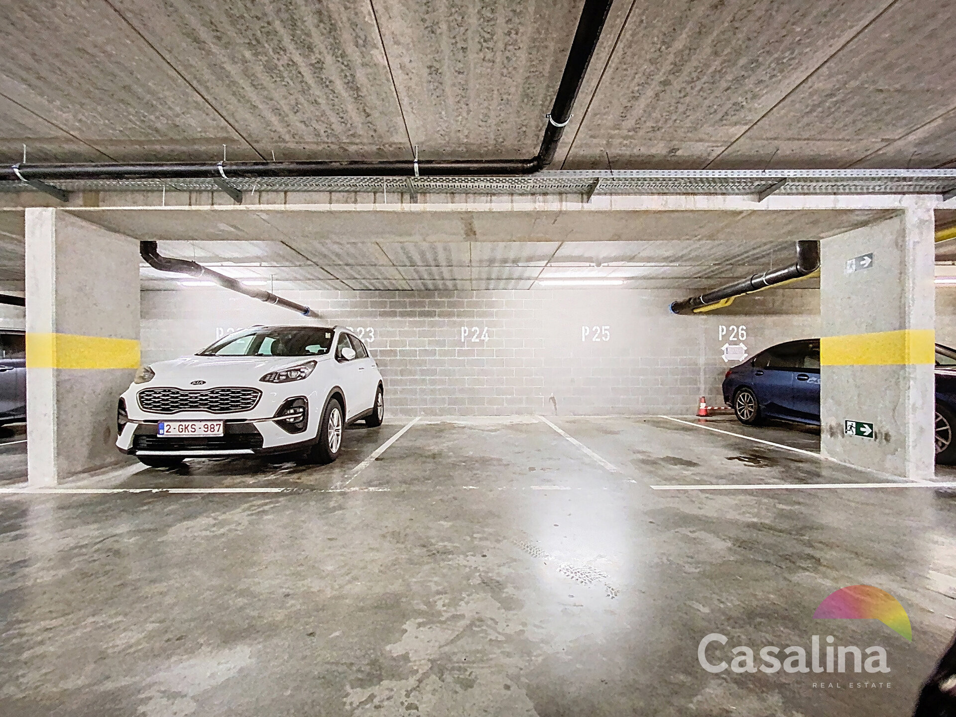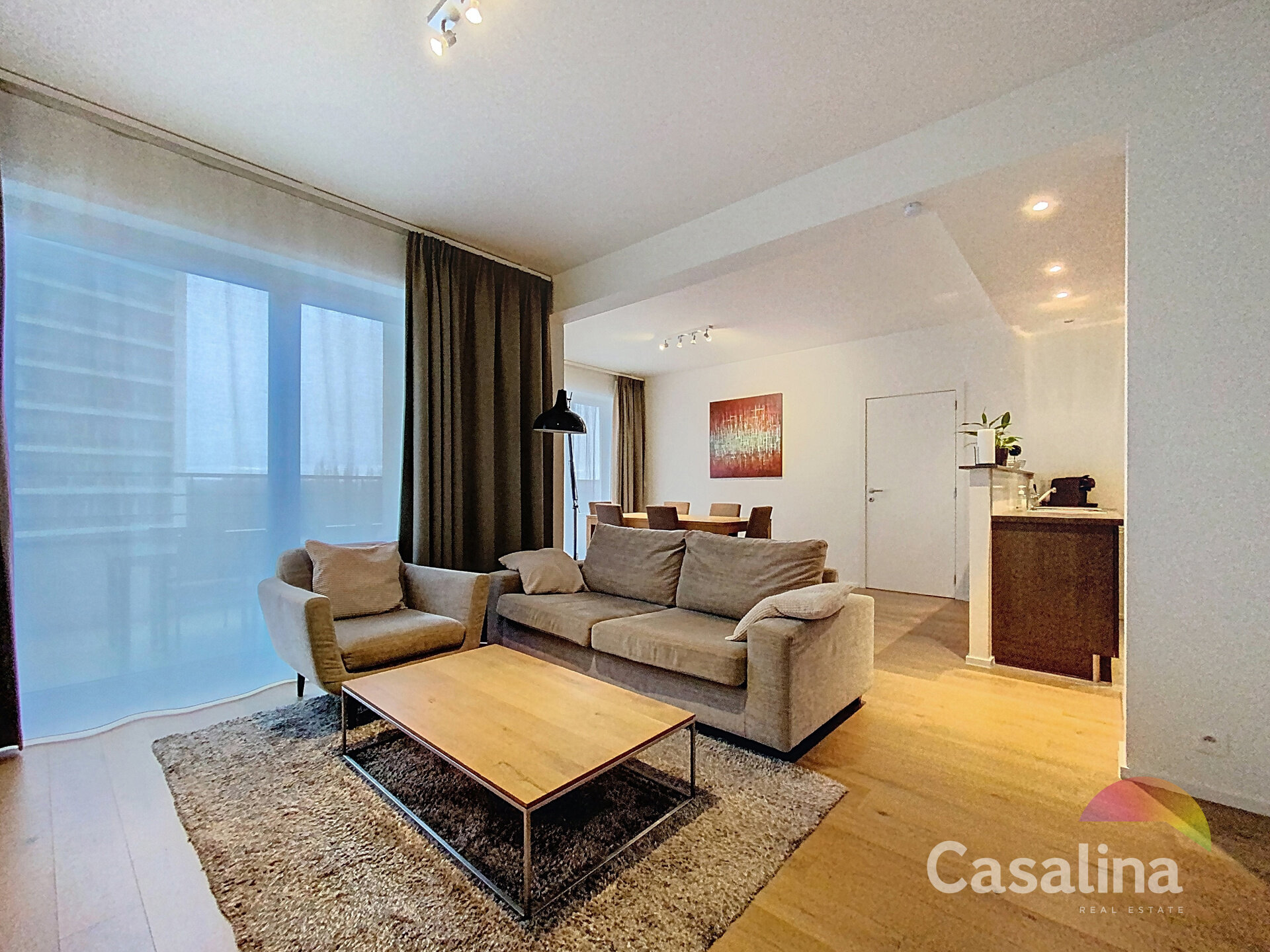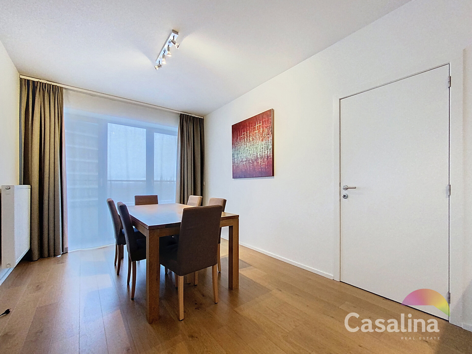 Casalina Real Estate exclusively offers this spacious 87 m² apartment (according to the EPC report), featuring a beautiful 14 m² terrace, located on the sixth floor of a well-maintained building dating from 2015. The apartment comprises an entrance hall with built-in wardrobes and cloakroom, a separate toilet, a practical storage/laundry room with connections for a washing machine and dryer, a spacious and bright living room with access to the front-facing terrace, a fully equipped open-plan kitchen, two bedrooms—one of which has access to the terrace—and a bathroom with double washbasin.
