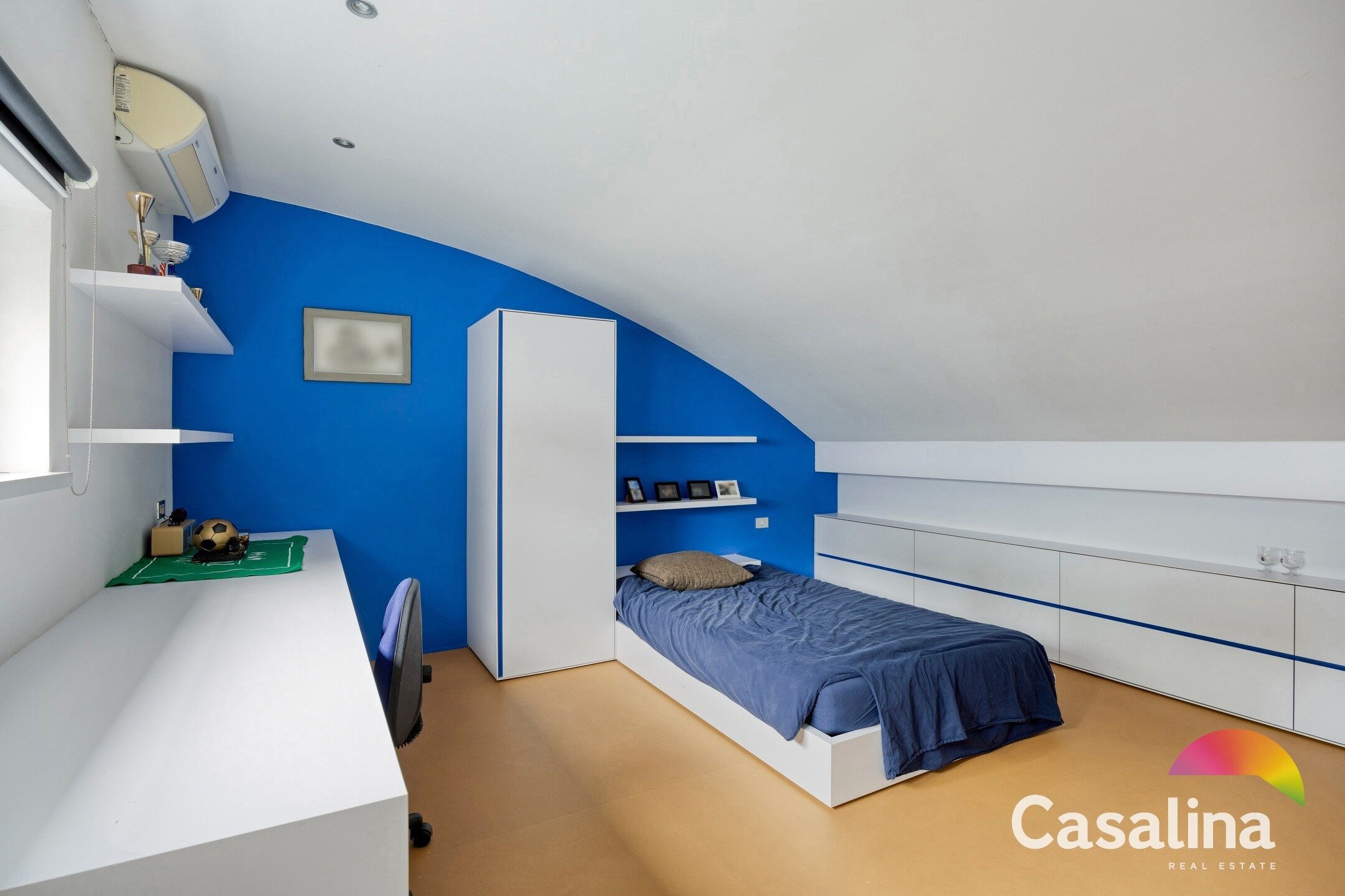 Premier étage: Un escalier ouvert mène au bel-étage, où se trouvent le vaste séjour et la salle à manger, caractérisés par de grandes baies vitrées. Un escalier en colimaçon mène à une mezzanine faisant office de bureau. On y trouve également une pièce supplémentaire pouvant servir de chambre d’amis ou de hobby. La cuisine ouverte moderne est reliée à une buanderie pratique. À ce niveau se situe aussi un espace de nuit avec trois chambres – dont deux en style duplex – et deux salles de bains reliées par une douche commune.