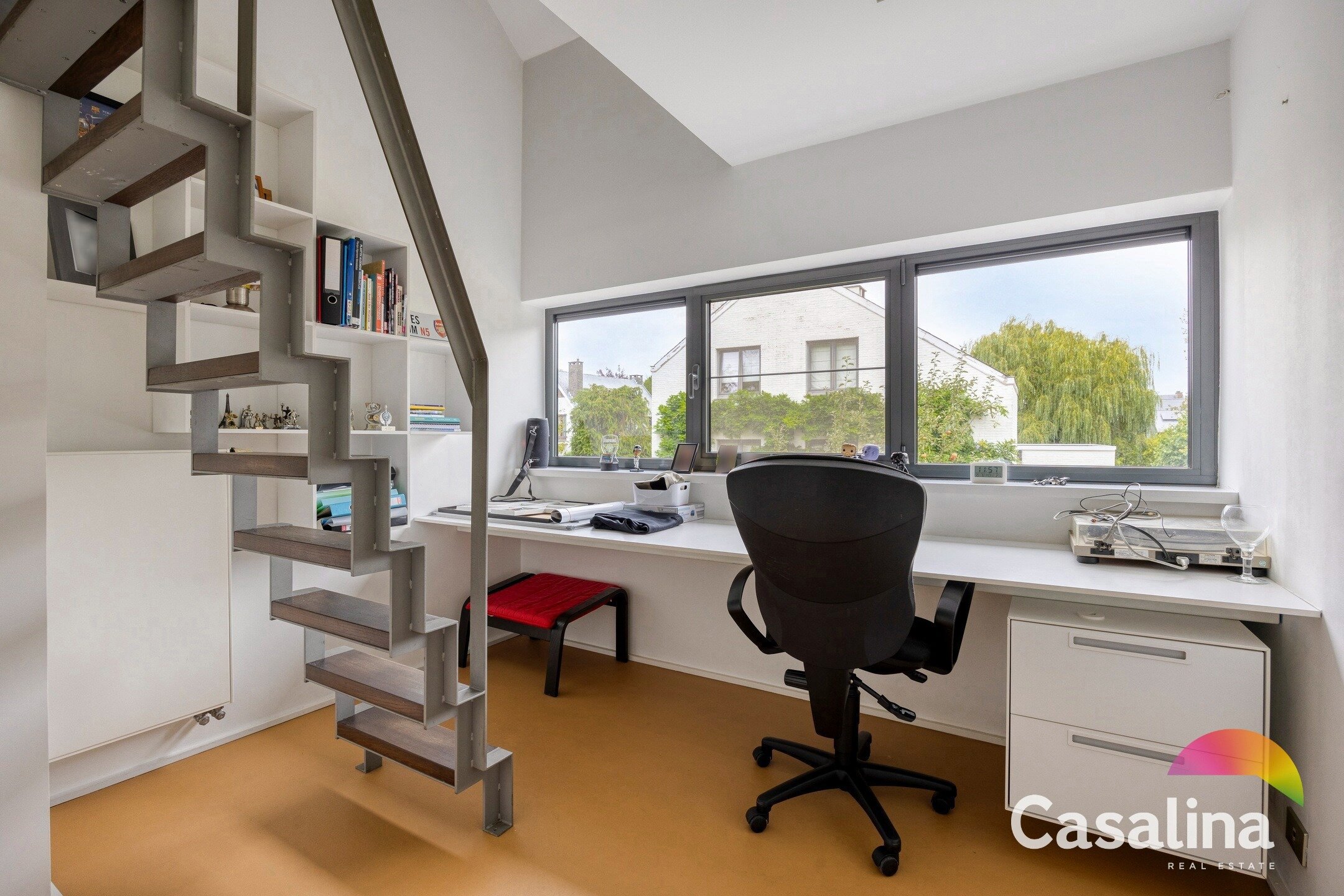 Eerste verdieping: Via een open trap komt men op de bel-etage, waar de ruime woon- en eetruimte zich bevindt, gekenmerkt door hoge raampartijen. Een wenteltrap leidt naar een vide die dienstdoet als bureau. Hier bevindt zich ook een extra hobby- of logeerkamer. De moderne open keuken sluit aan op een praktische bijkeuken. Op dit niveau bevindt zich ook een slaapgedeelte met drie slaapkamers – waarvan twee in duplexstijl – en twee badkamers die via een gedeelde douche met elkaar verbonden