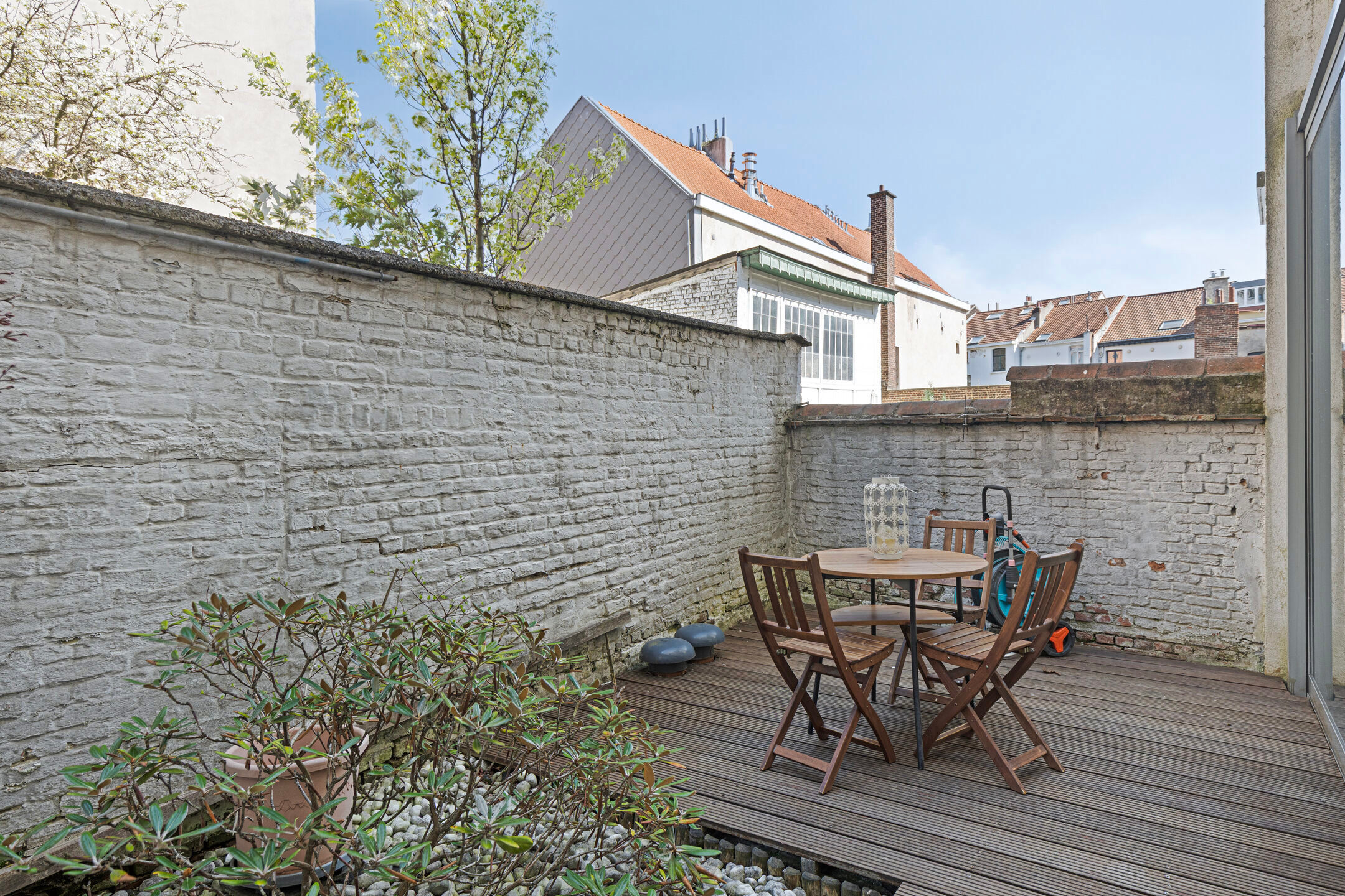 Bij binnenkomst wordt u verwelkomd door een stijlvolle inkomhal die leidt naar een volledig ingerichte keuken van 15 m². De ruime en lichte woonkamer met eetgedeelte (30 m²) heeft directe toegang tot het terras en de knusse stadstuin.