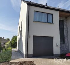 Op het gelijkvloers een inkomhal met gastentoilet en vestiaire. Van daaruit komt u in de lichtrijke en ruime leef- en eetruimte met open keuken. Via de garage bereikt u de handige bijkeuken of wasruimte.