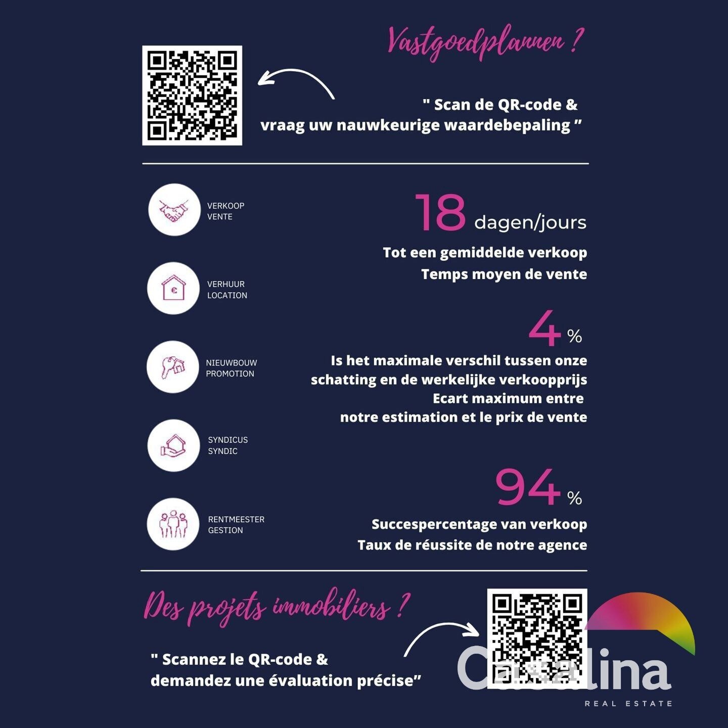 Overweegt u zelf uw eigendom te verkopen? Ontdek onze formule “Verkoop zonder zorgen” – Casalina Real Estate begeleidt u van A tot Z, met professionele foto’s, juridisch advies en persoonlijke opvolging. Vraag gerust naar onze voorwaarden.